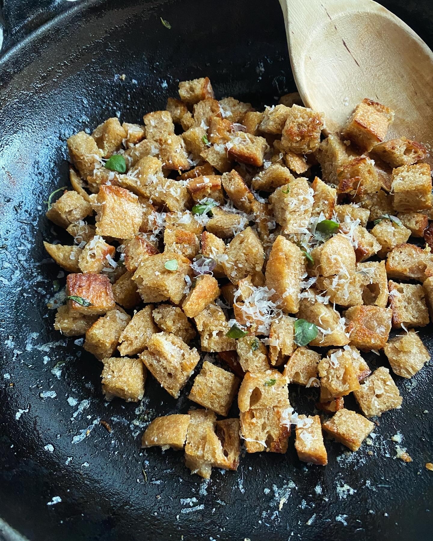 Tips: It is best to use hearty-ish bread to make these croutons. I bake a lot of sourdough and a lot of times I’ll take the last couple of slices and make croutons to have with an upcoming dinner. If you are not a bread baker this recipe is still for you. Use up the last few slices of an artisan bread from the bakery to do the same thing.